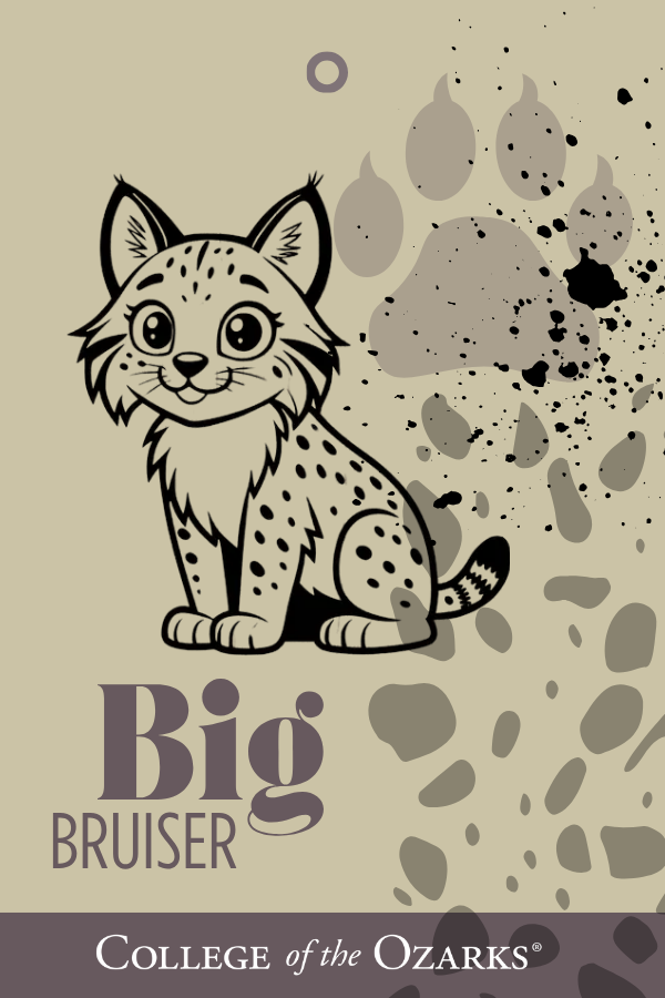 Bruiser the bobcat is the beloved mascot of the College of the Ozarks, and he's always up for an adventure! On campus, he loves to roam around, showing off his school spirit by cheering at sports games and rallying students with his loud roars. When he's not leading the cheer, Big Bruiser enjoys exploring the beautiful campus, playing hide and seek among the trees, and lounging in the sun.