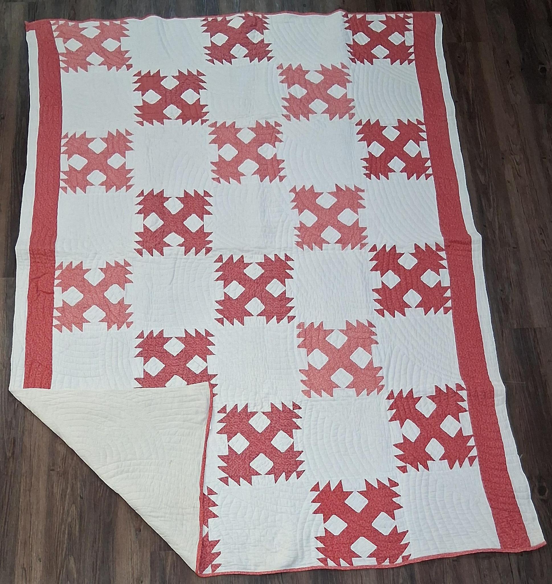 1880's-90's Red and White Watermelon Rose Quilt. Hand-pieced. Baptist fan hand quilting @ 7-8stitches/inch. Excellent Condition. 62" X 84".