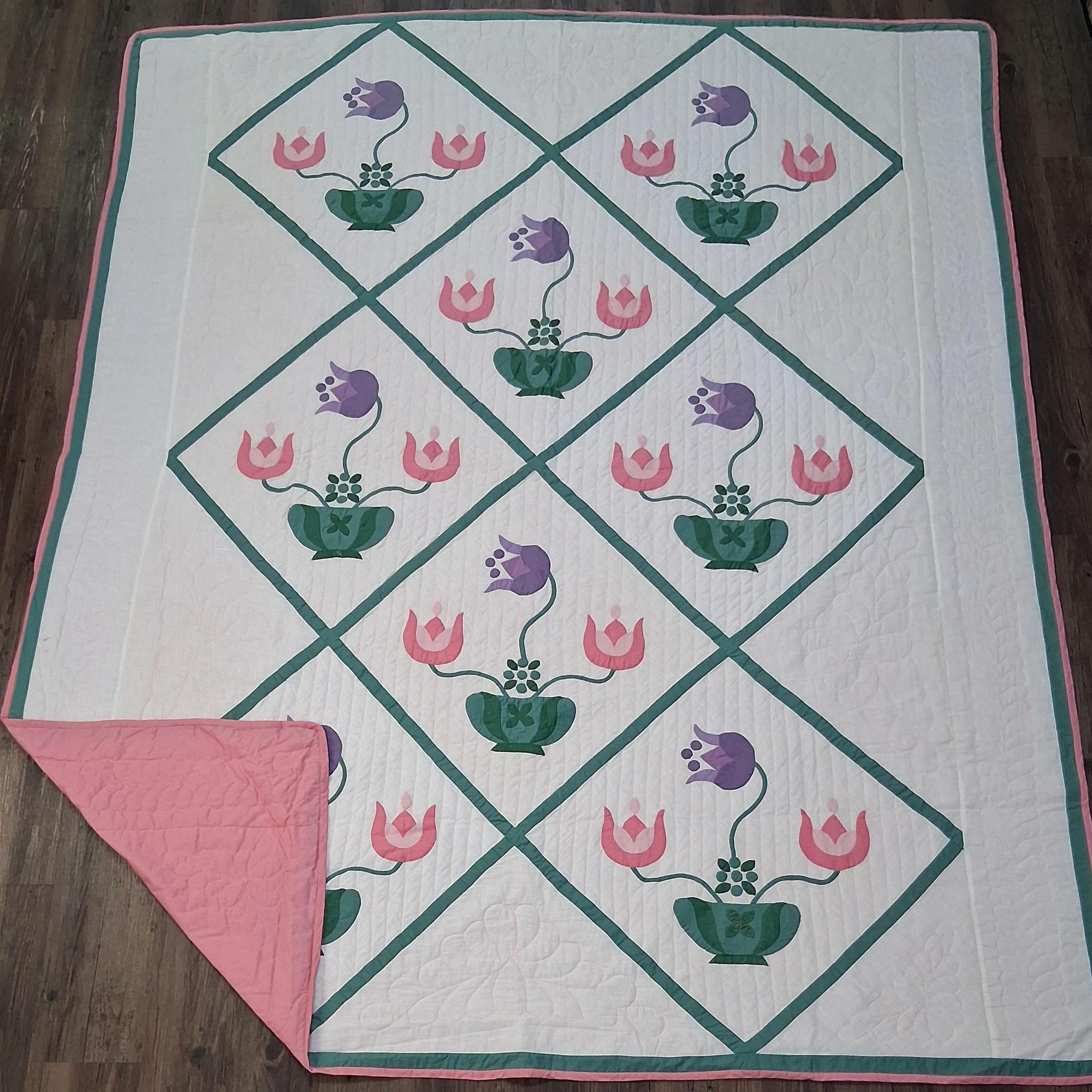 1938 Tulip Bowl Appliqued Quilt Top. Hand feather and straight-line quilting @ 8 stitches/inch. Love the matching pink binding and back.