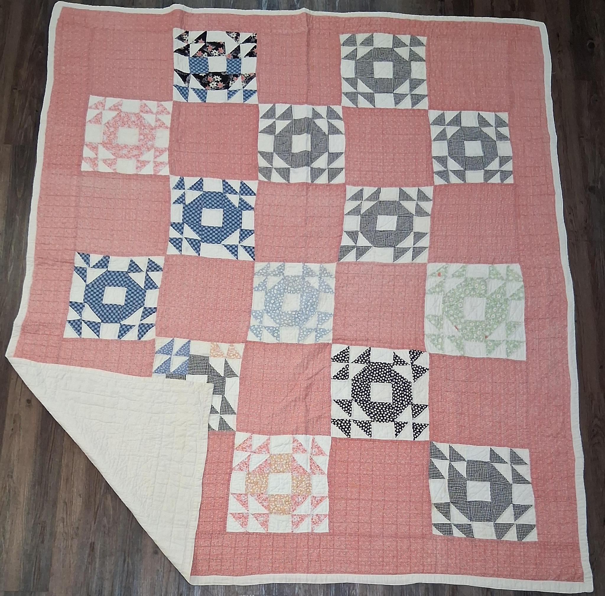 Crosshatch and outline hand quilting @ 8-9 stitches/inch. Love the early calicoes. Very good Condition. 74"X 84".