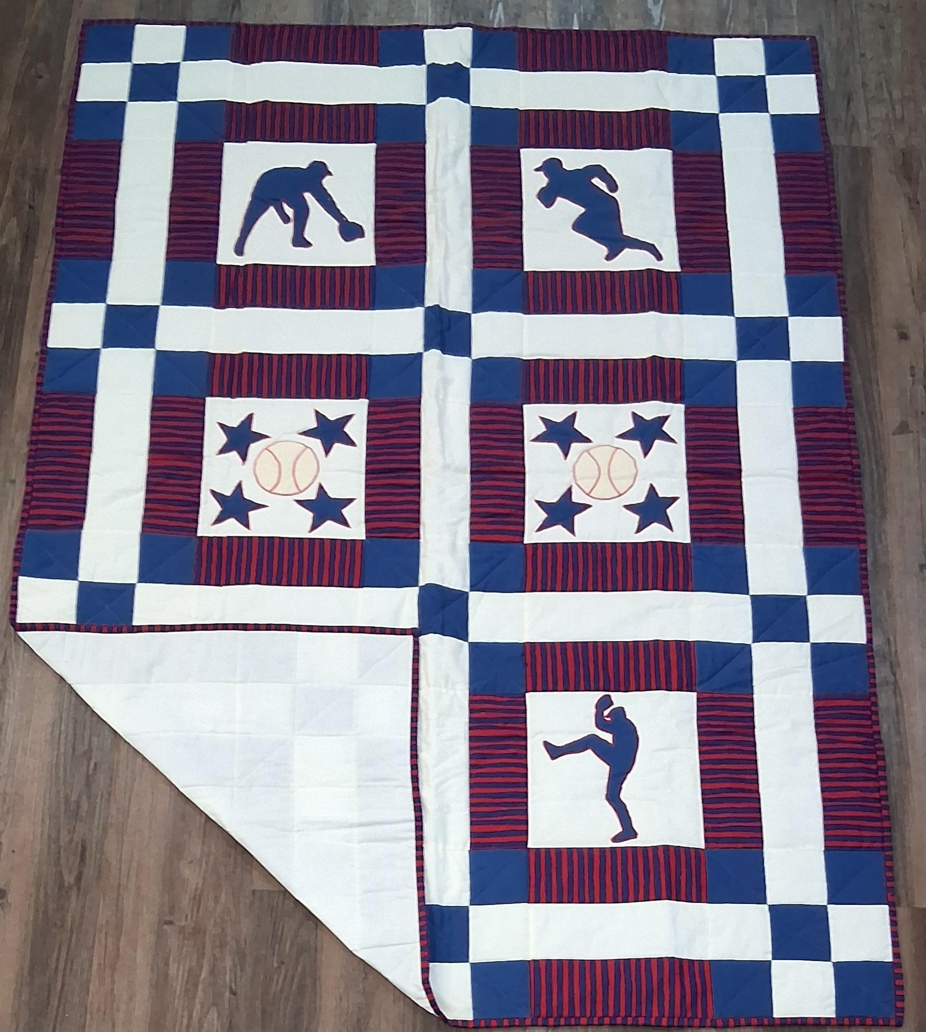 Red, White, and Blue Sports Themed Quilt. Great striped borders. Perfect for your little athlete. Mint Condition. 46" X 63".